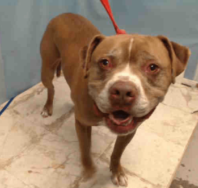 A5352446 “Cruzer” 6 year old neutered male, Brown and White Pit Bull.